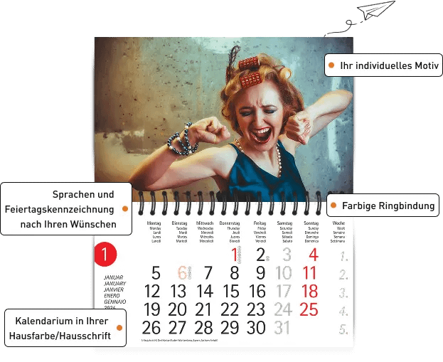 Gestalten Sie Kalender ganz nach Ihren Wünschen: mit Logo, Farben, Firmen-CI oder individuellen Motiven. Ob für Kunden, Mitarbeiter oder als exklusives Geschenk – wir machen jeden Kalender zu einem Unikat.