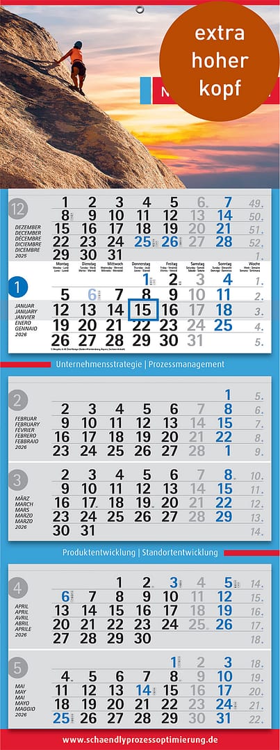 Ob als Ein- oder Mehrblockkalender, mit drei, vier, fünf oder sogar sechs Monaten auf einen Blick – professionelle Wandkalender für Ihr Marketing bleiben das ganze Jahr im Blick Ihrer Kunden.